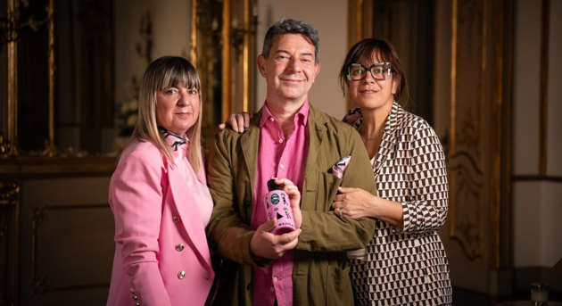 L’immagine che Biscalchin ha costruito per la bottiglia — fondo rosa pastello, personaggi in “black tie” con chiome d’ulivo intenti a suonare strumenti — trasforma gli ulivi in musicisti della natura, figure corali e dinamiche in cui ogni elemento concorre a una composizione visiva leggera e riconoscibile.