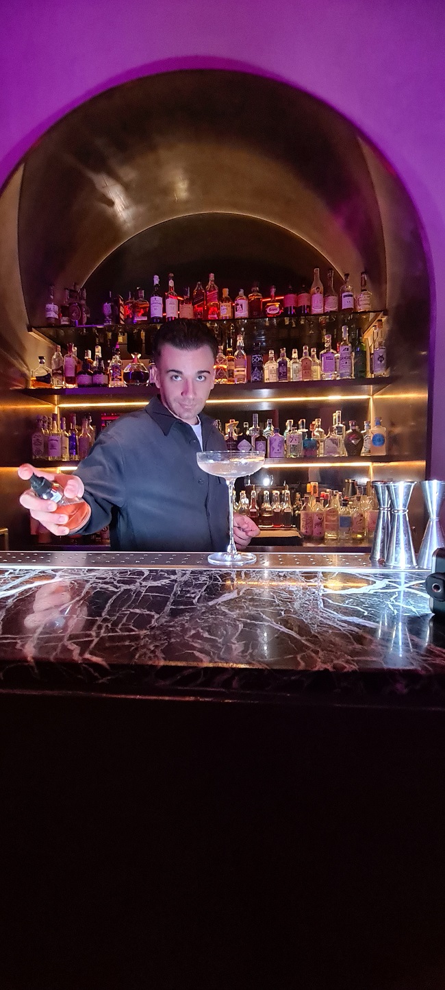 Il menù dei cocktail, curato da Riccardo Marinelli (ex Jerry Thomas di Roma), si divide in signature, twist sui classici e mocktail. Il leitmotiv è la semplicità, con grande attenzione alle materie prime e tecniche di preparazione che riducono al minimo gli interventi sul prodotto per valorizzarne l’essenza. Lo yuzu, l’agrume giapponese dal sapore aromatico, è uno degli ingredienti principali, presente in diversi drink. Tra i più rappresentativi ci sono il 520 (14 euro), un cocktail fresco a base di Altamura vodka, succo di pompelmo rosa e yuzu e Franciacorta, e l’Araki, una rivisitazione del Whisky Sour con un mix di succo di limone e di yuzu, miele alla soia e zenzero e con l’aggiunta di bitter al cioccolato (14 euro)
