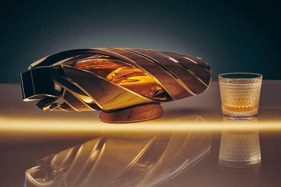 Il whisky è contenuto in una bottiglia di vetro, materiale simbolico per entrambi i marchi, progettata per essere esposta orizzontalmente, rompendo le convenzioni della tradizionale postura verticale. Il design innovativo presenta una torsione di 180 gradi che riflette la traiettoria orizzontale caratteristica del mondo automobilistico, incarnando un approccio rivoluzionario al prodotto.